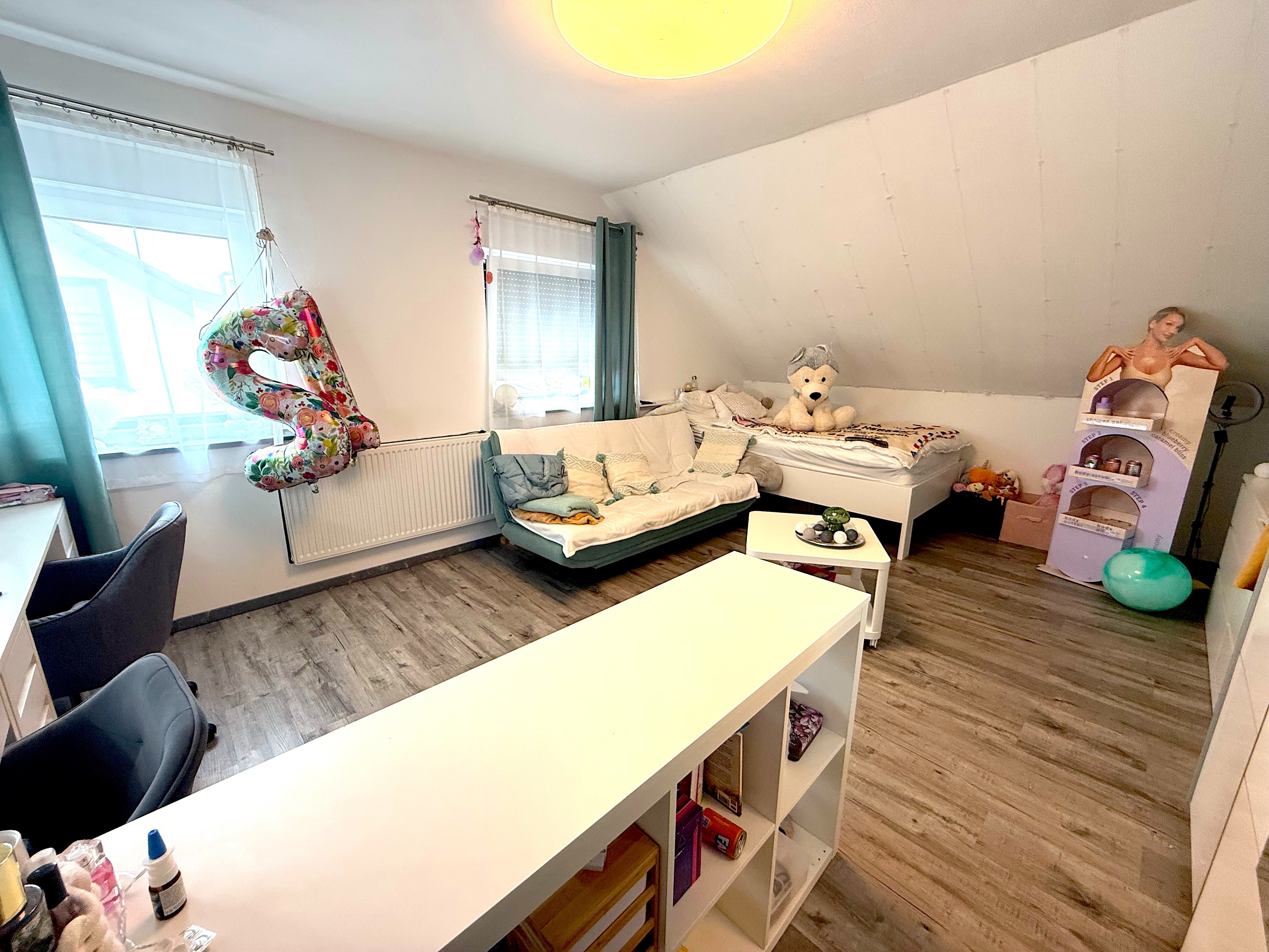 Das im Jahr 1978 erbaute Zweifamilienhaus befindet sich in einem neuwertigen Zustand und besticht durch seine solide Massivbauweise. Auf einer Grundstücksfläche von 661 m² erstreckt sich das Gebäude über zwei Etagen und bietet insgesamt 248,62 m² Wohnfläche. (Haupthaus ca 184m² Wohnfläche + Einliegerwohnung ca. 64m² Wohnfläche)