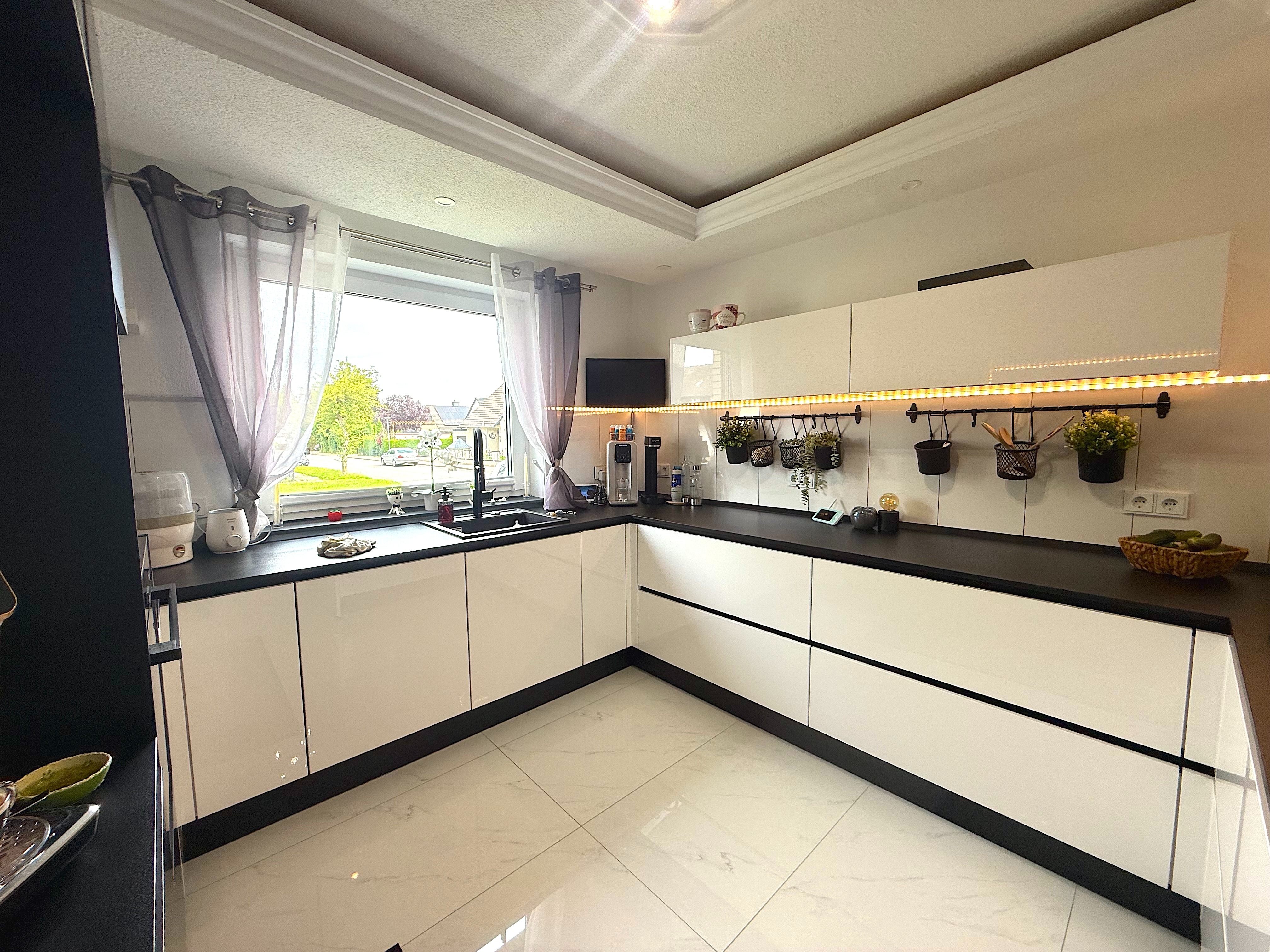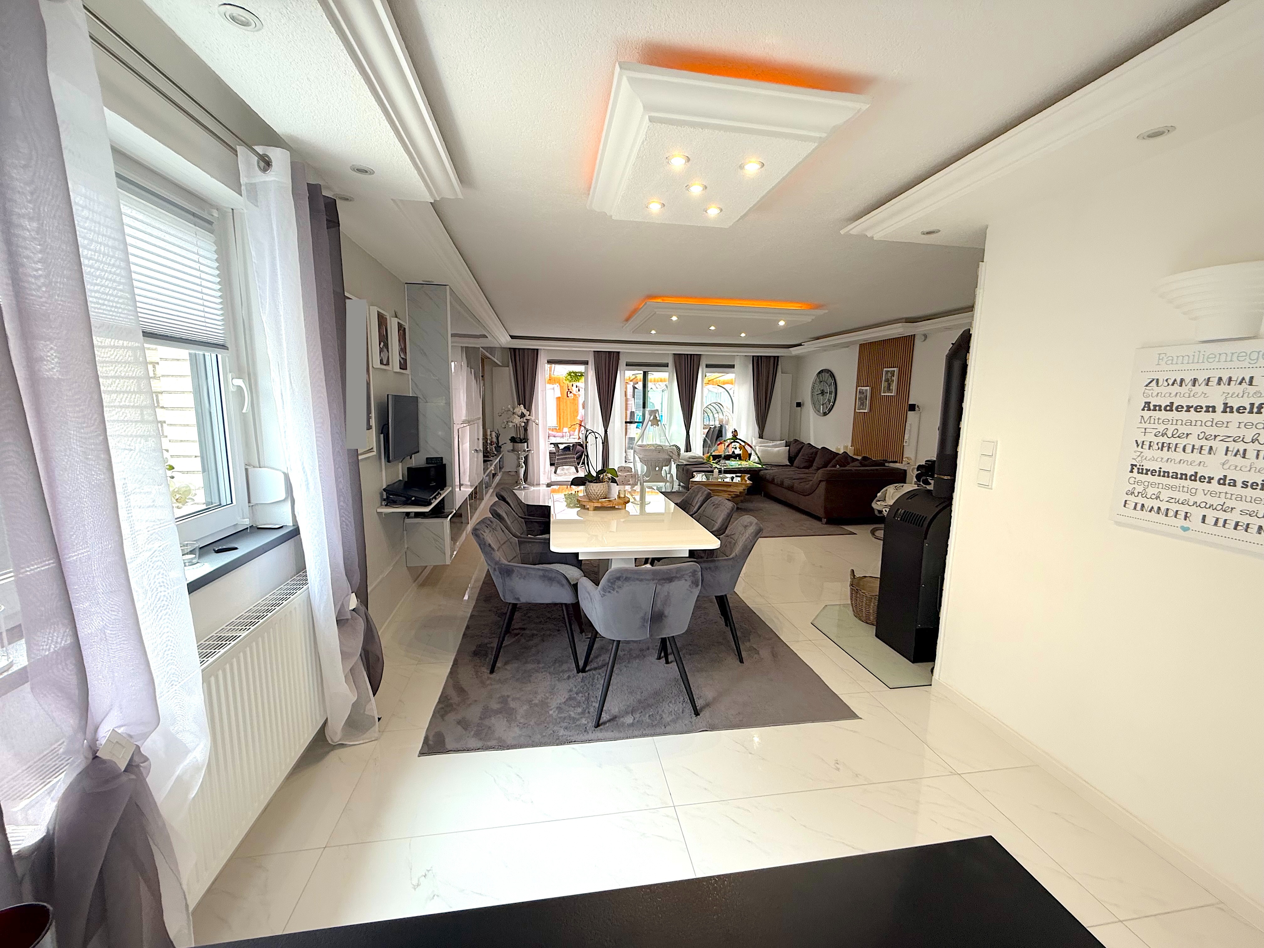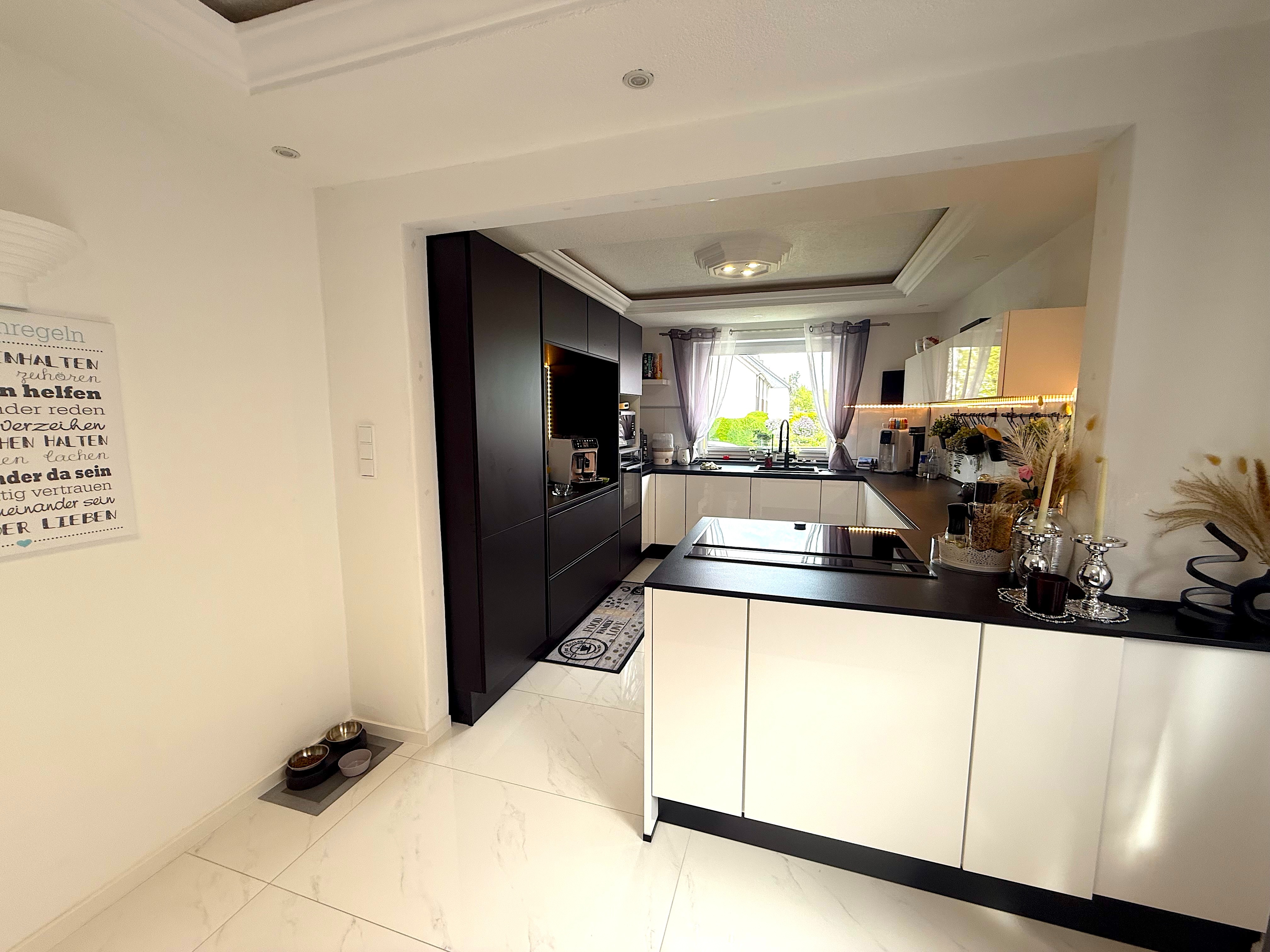 Die Immobilie verfügt über ein Badezimmer mit Fenster, Badewanne und Dusche. Zudem ist ein Kamin im Wohnbereich vorhanden. Rollläden sind an den Fenstern installiert. Die Bodenbeläge in der Wohnung sind Fliesen, PVC und Vinyl. Darüber hinaus gibt es eine Gästetoilette und einen Wintergarten. Die Qualität der Ausstattung ist gehoben und bietet somit einen modernen und komfortablen Wohnstandard. Die auf den Bildern zu sehende Einbauküche kann für 16.000€ erworben, sodass der Kaufpreis sich dann auf 515.000 belaufen würde.