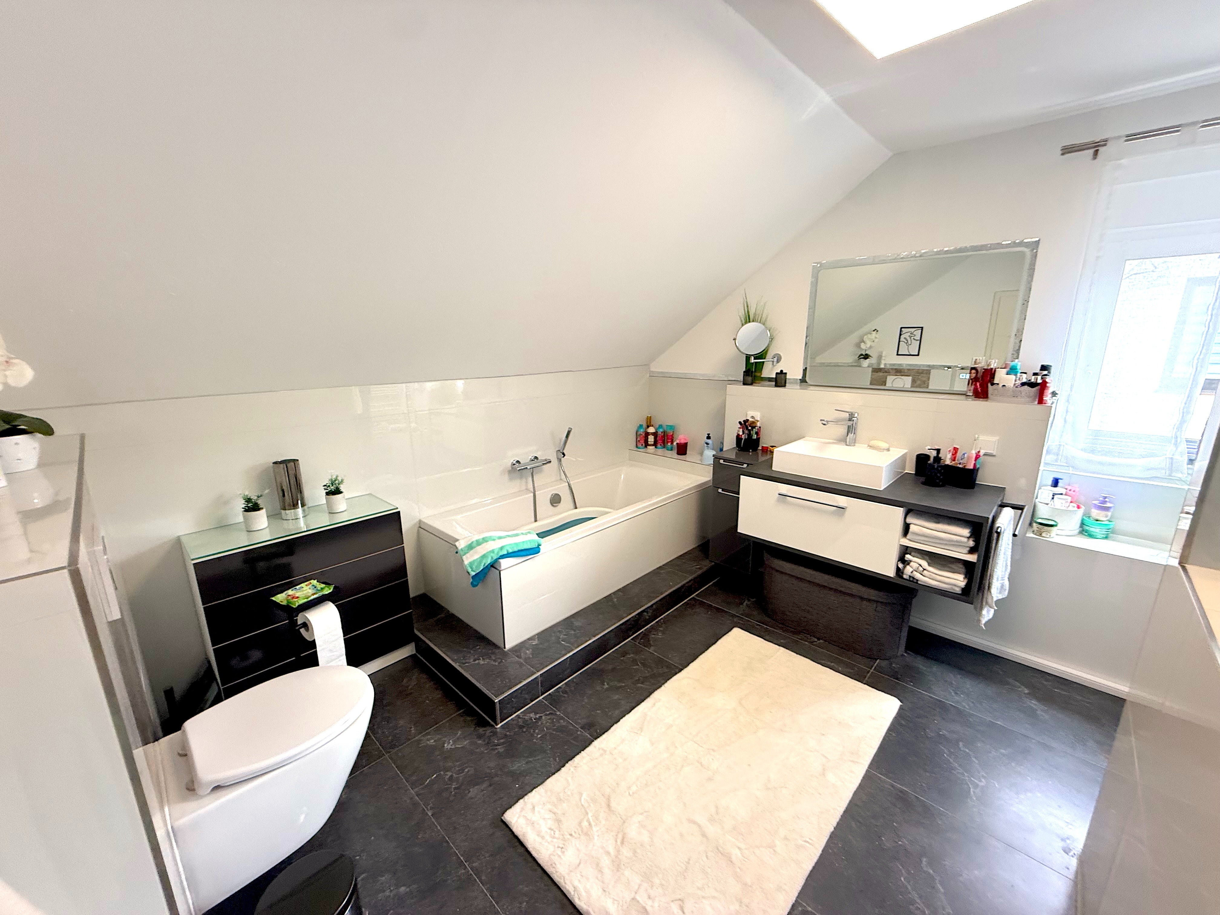 - Ausstattung des Bades Fenster, Badewanne, Dusche